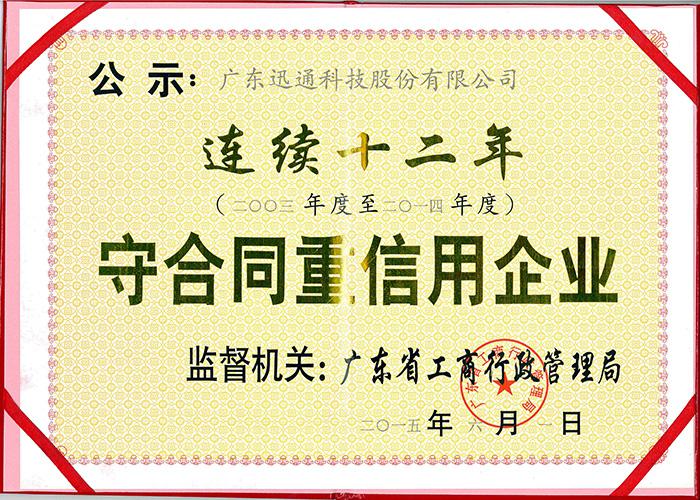 迅通以良好的企业信誉与口碑荣获“连续十二年守合同重信用企业”,这一荣誉更坚定了迅通“诚信、务实、创新、领先”的企业精神。